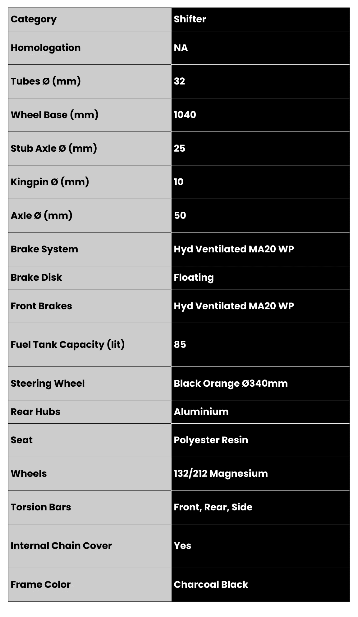 Designed for both performance and aesthetics, this kart features a charcoal black bodywork crafted from aluminum and polyester resin, offering durability and aerodynamic efficiency. It comes fitted with magnesium wheels (132/212) for reduced weight and improved handling, along with a black-orange Ø340 mm steering wheel for an aggressive racing feel. The 8.5L fuel tank ensures extended running time during intense sessions, while the full front, rear, and side protection ensures maximum driver safety — making the Annihilator Shifter a true contender for competitive karting.