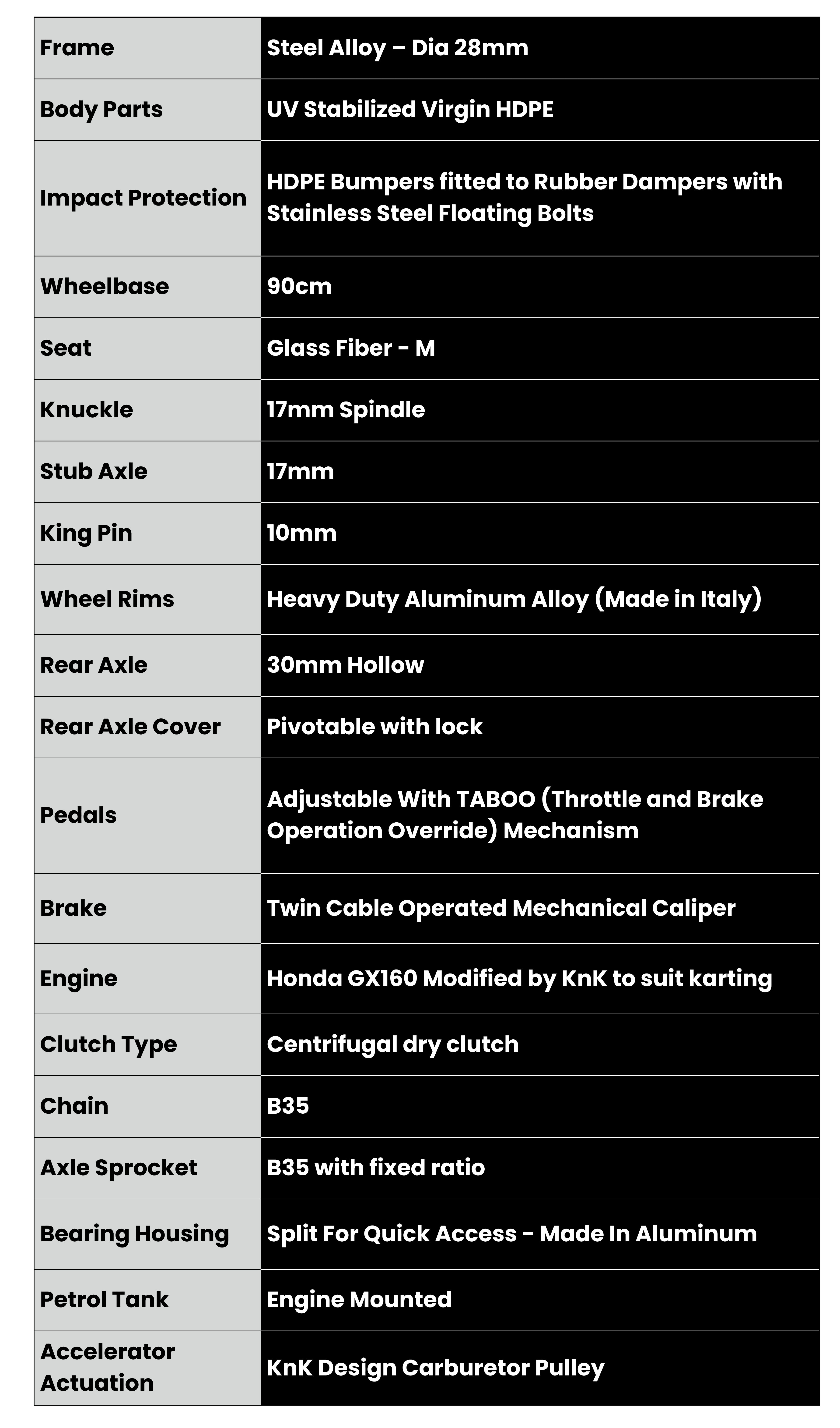 The Colt Sport can be equipped with either a 200cc or 160cc Honda engine, offering a perfect balance between power and reliability. Whether used for competitive racing or high-adrenaline recreational sessions, the Colt Sport delivers an engaging, smooth, and consistent performance. With its robust design and adjustable features, it stands as an ideal choice for racers who seek a professional-grade experience at the club level.