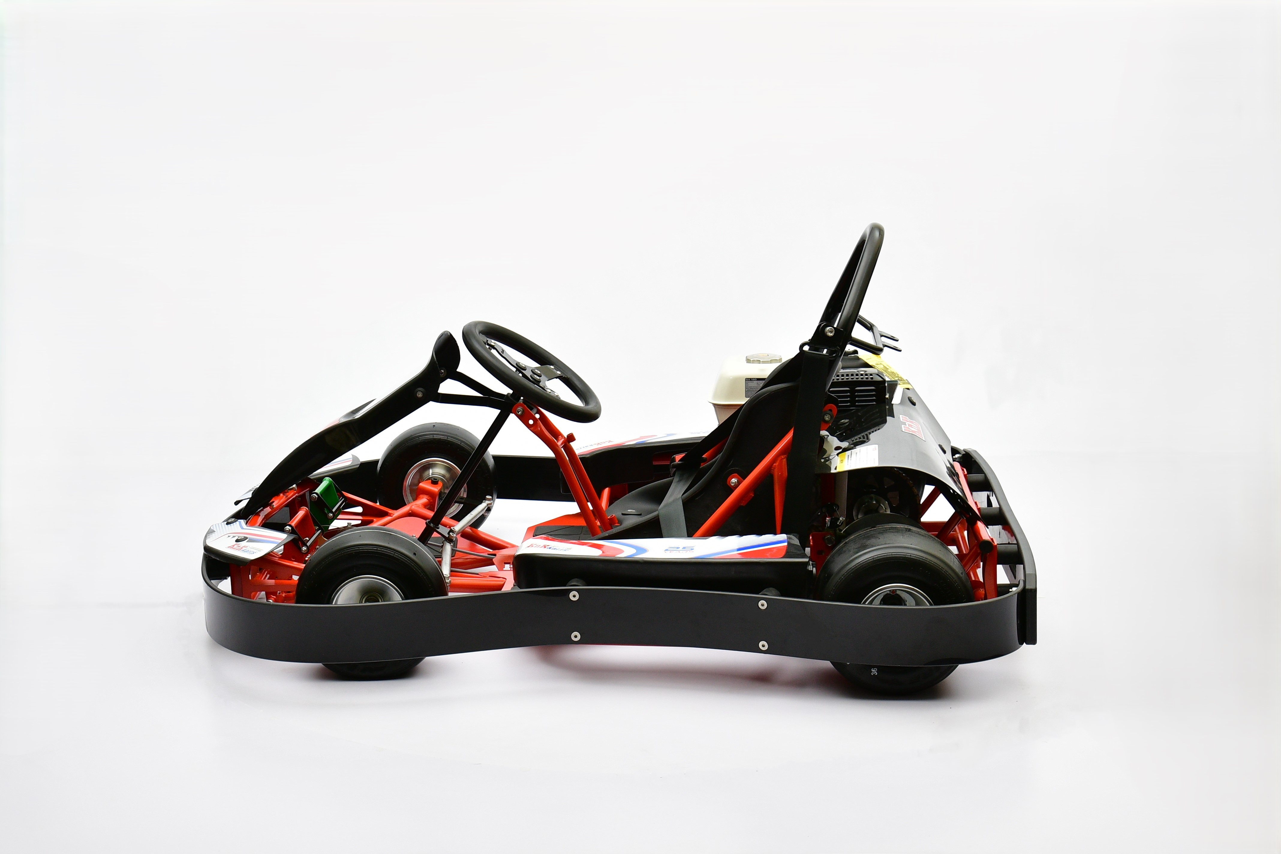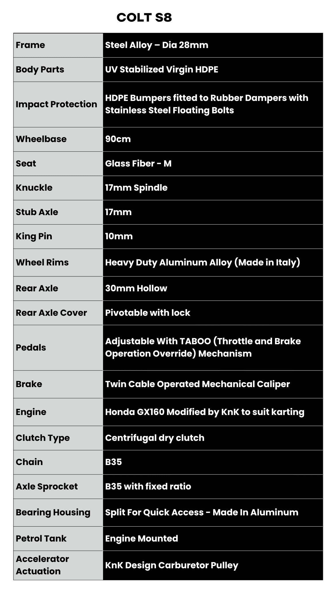 Powered by a Honda 160cc engine delivering 5.5 hp, the Colt S8 ensures reliable performance with smooth power delivery. It uses a centrifugal dry clutch and a B35 fixed ratio sprocket for consistent acceleration. Built on a 28mm steel frame with a 90cm wheelbase, it ensures stability and control. The kart features mechanical caliper brakes, Italian aluminum alloy wheels, and a 30mm hollow axle for durability. The body is made of UV-stabilized virgin HDPE, and the engine-mounted fuel tank provides a compact and efficient layout, making the Colt S8 a perfect blend of fun, safety, and performance for young drivers.