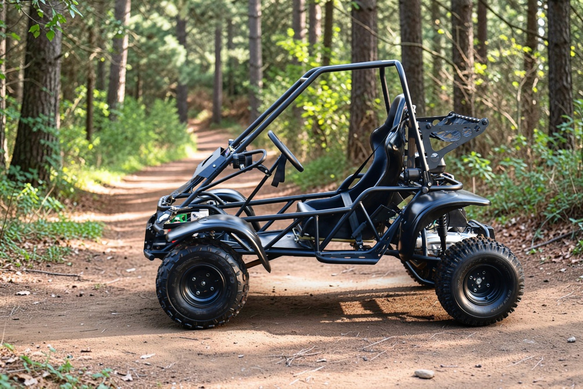 Performance & Drivetrain 200cc Engine Producing 12 HP: Delivers strong and reliable power for off-road applications. Reverse Gearbox with Electric Start: Ensures effortless starting and easy maneuverability in challenging terrain. Reworked Final Drive Ratio: Optimized for better torque delivery and smoother handling. Braking & Safety Hydraulic Braking System: Provides superior stopping power and consistent braking performance. Parking Brake: Added safety and control on slopes and uneven surfaces. Lighting & Visibility Front LED Fog Lights: Enhanced illumination for off-road and low-visibility conditions. Powerful LED Headlights: Improved night-time visibility and safety. Reverse Light: Increased safety while reversing. Stop Light: Ensures better visibility and safety awareness. Overall Experience Easy to Drive and Maneuver: Designed for better handling and driver confidence. Fun, Safe, and Rugged: Built to deliver an engaging off-road driving experience with modern features.
