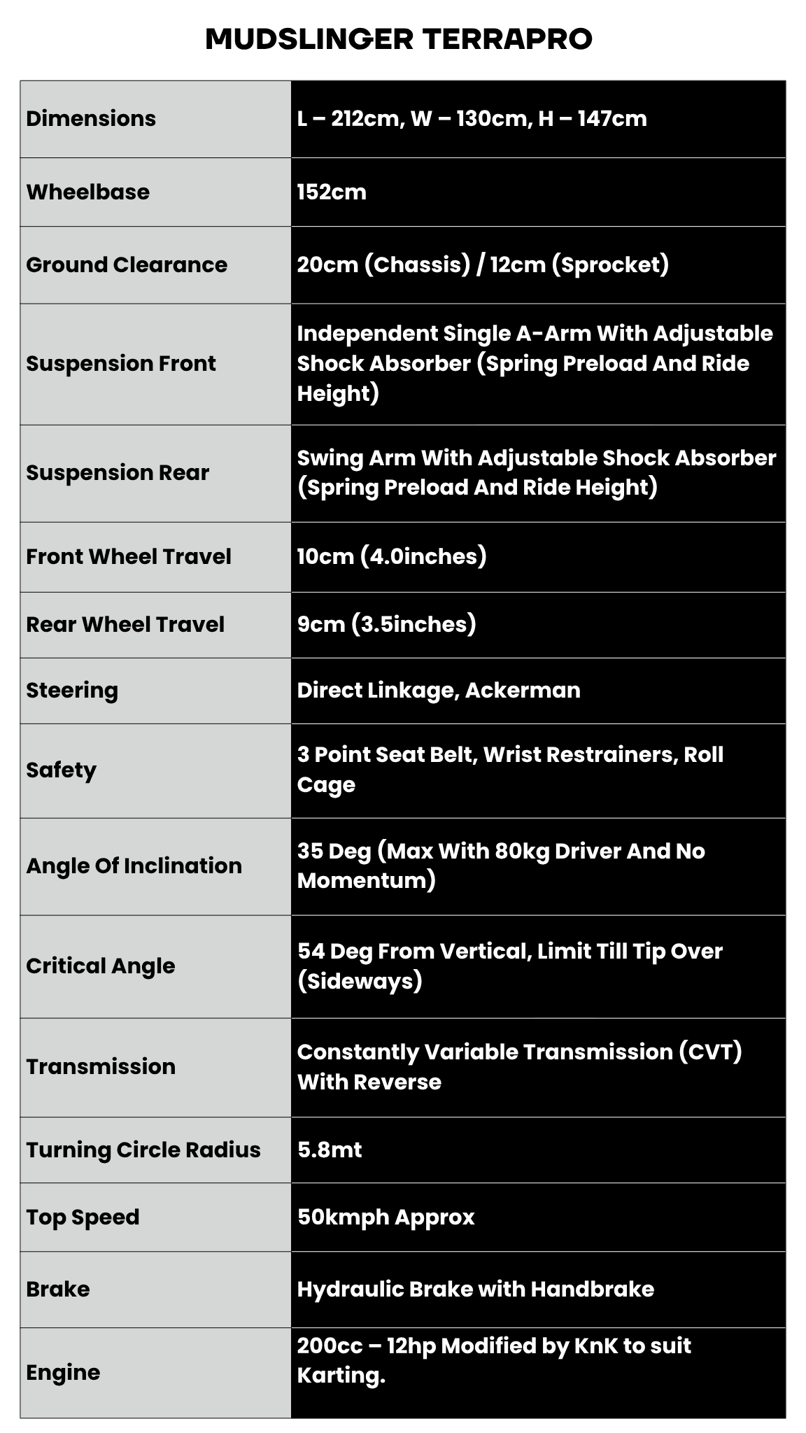 Powered by a robust 200cc engine producing 12 HP, the Mudslinger features a reverse gearbox with electric start for effortless operation and improved maneuverability. Its reworked final drive ratio ensures better torque delivery and smoother handling, while the hydraulic braking system and parking brake provide enhanced safety and control. Equipped with DRLs and powerful LED headlights, reverse light it offers excellent visibility in all conditions. Easy to drive yet rugged in build, the Mudslinger delivers a fun, safe, and confidence-inspiring off-road experience.