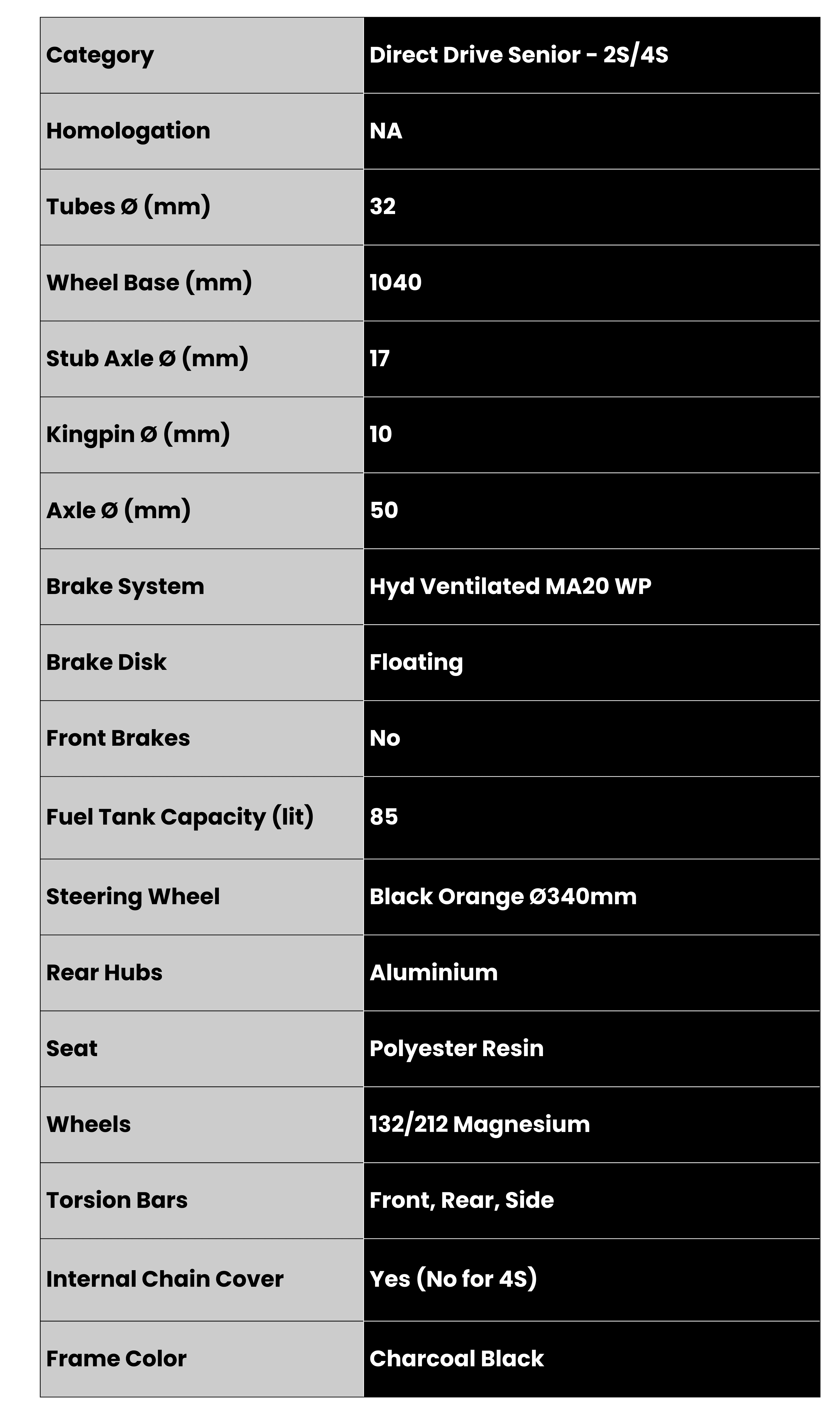 Equipped with hydraulic ventilated MA20 WP floating brakes, an 8.5-liter fuel tank, and 132/212 magnesium wheels, the Rebel 322 ensures superior braking efficiency and control on any track. The kart features aluminum and polyester resin bodywork with complete front, rear, and side protection (front and rear only for 4S setup), along with a large glass fiber seat for comfort and durability. With its adaptable design, the KnK Rebel 322 excels across multiple racing conditions, making it an ideal choice for drivers seeking professional-grade performance and reliability in a versatile direct-drive kart.