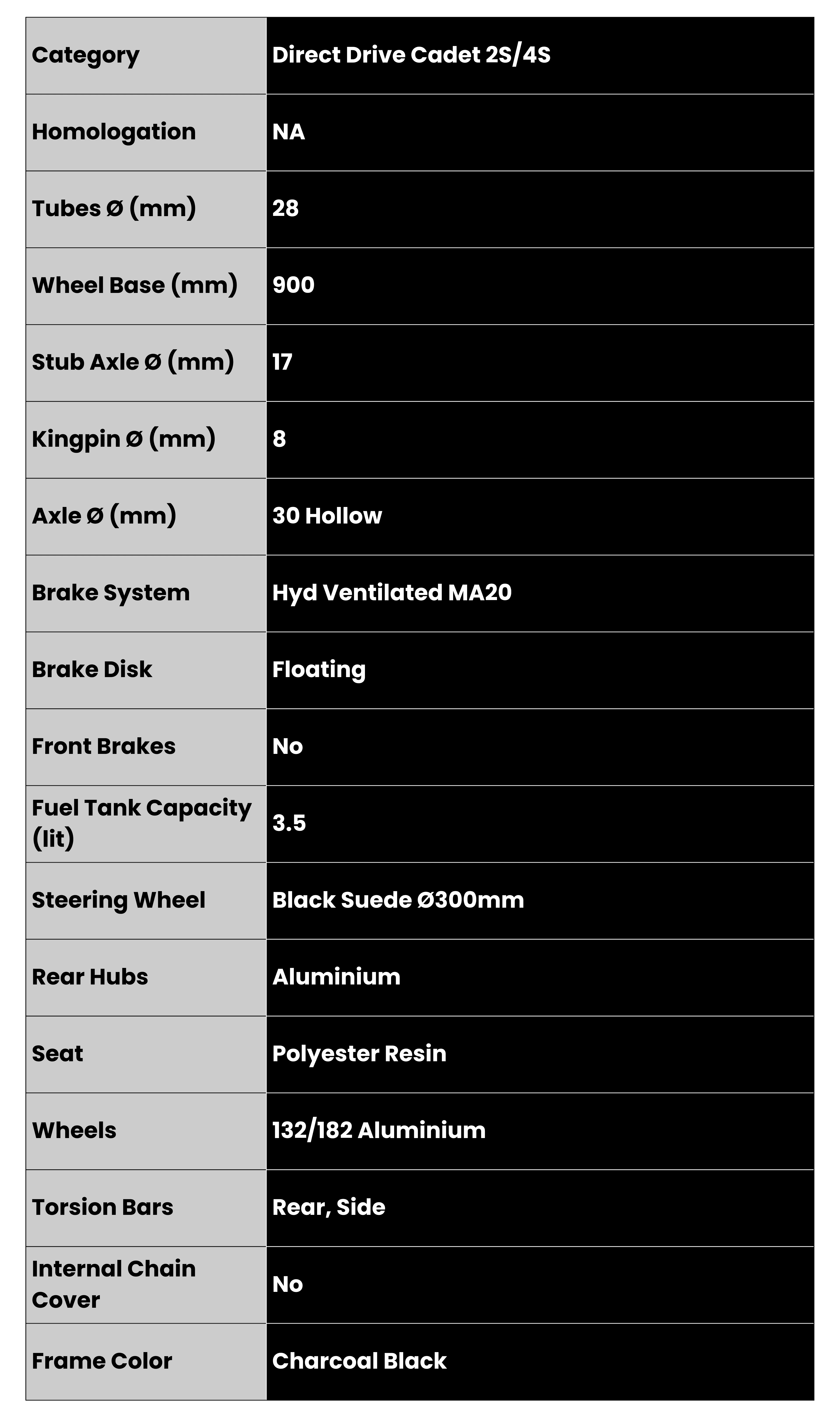 The KnK Velocity 4S is a purpose-built cadet kart designed to deliver performance, precision, and control for young racers in both 2-stroke and 4-stroke categories. Built on a 28 mm steel alloy frame with a 90 cm wheelbase, this lightweight chassis provides excellent maneuverability and stability, making it ideal for learning race dynamics and competitive cadet racing. Its robust design, complemented by a powder-coated charcoal black finish and a black suede Ø300 mm steering wheel, offers both durability and style on the track.