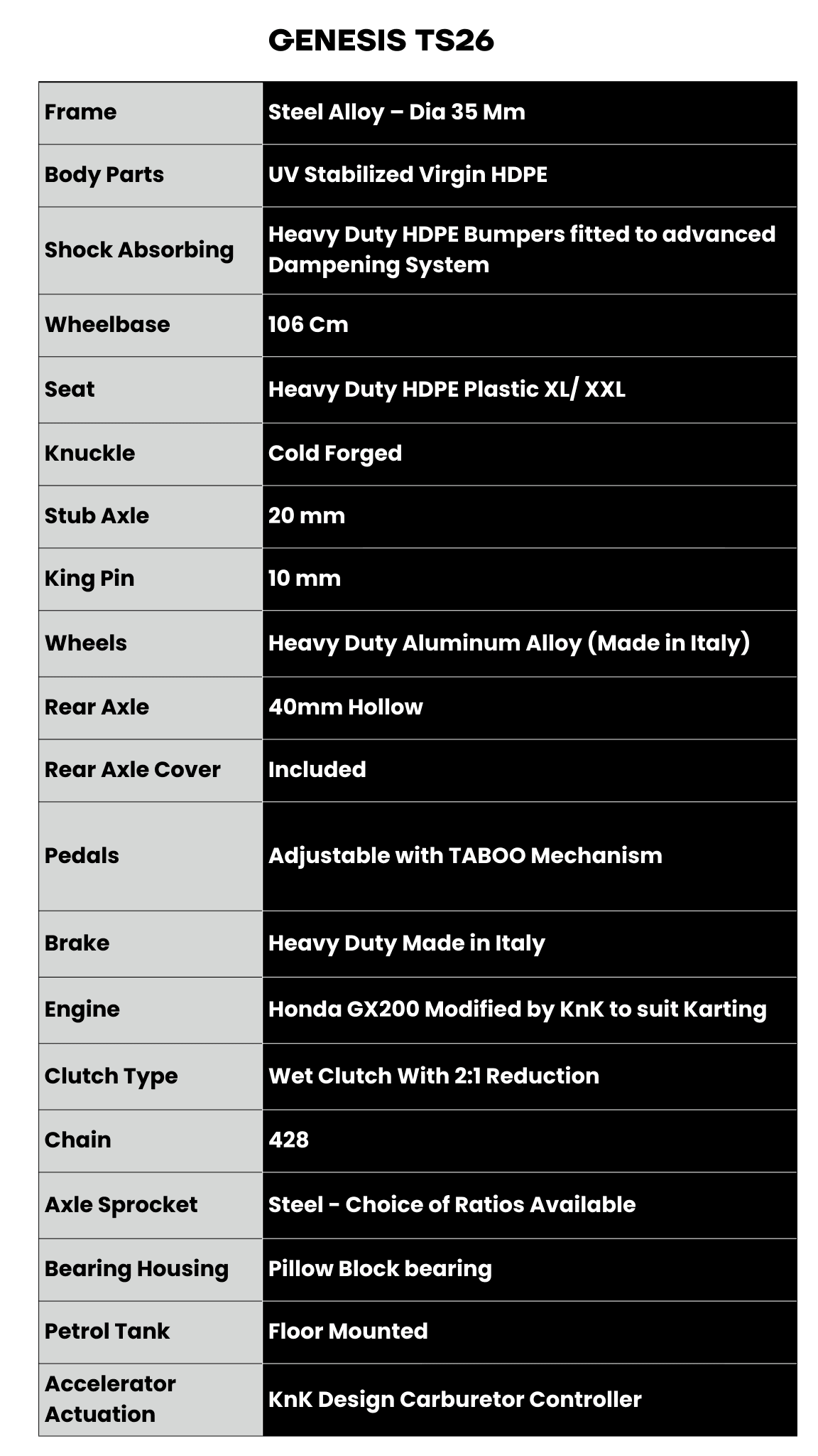 The Genesis TS26 is built on the strong and reliable Genesis SX-type chassis. Compact in design, it offers easy maneuverability and convenient storage. Designed for family entertainment, the TS26 is a durable and feature-rich double seater kart.